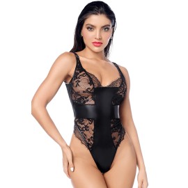 Tout le génie de ce body réside dans le dialogue visuel entre deux matières radicalement opposées. La dentelle florale transparente en 100 % polyamide apporte légèreté, romantisme et transparence, laissant entrevoir la peau à travers ses motifs délicats. Les empiècements en similicuir — enduction 100 % polyuréthane sur base 97 % polyester / 3 % élasthanne — viennent trancher par leur surface lisse et brillante, créant un effet de contraste mat/transparent saisissant sur la silhouette. Ce jeu de textures crée une profondeur visuelle que peu de pièces de lingerie peuvent revendiquer.