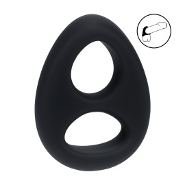 Il se distingue par sa double ouverture ergonomique : la grande boucle ovale supérieure accueille la base du pénis, tandis que la boucle inférieure plus petite enveloppe le scrotum. Ce maintien simultané des deux zones crée une pression conjointe et harmonieuse qui maximise la fermeté de l'érection, retarde l'éjaculation et accentue la plénitude ressentie à chaque mouvement. Ni trop serré, ni insuffisant — la forme en goutte aplatie épouse naturellement l'anatomie sans nécessiter d'ajustement.